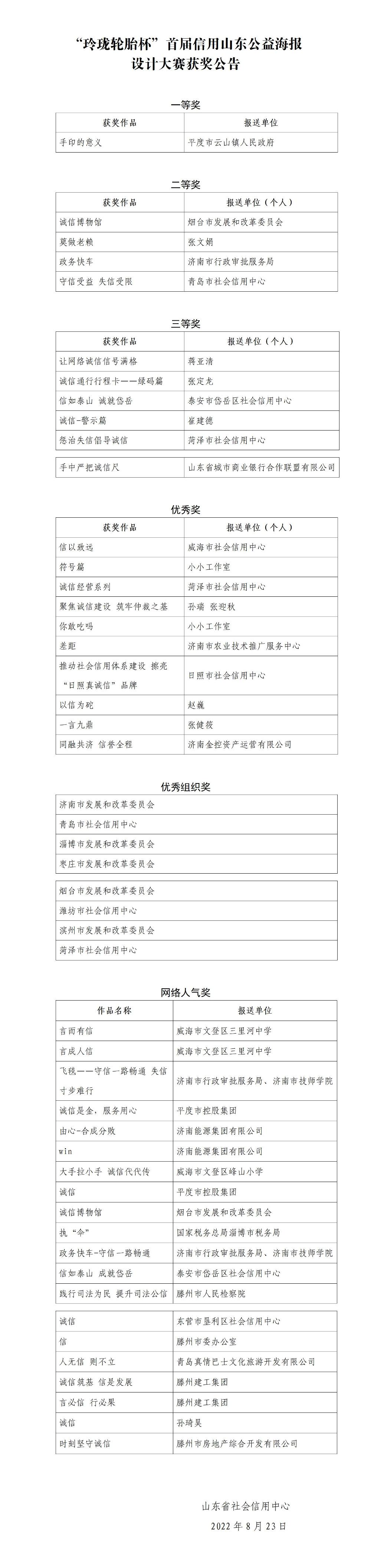 “玲珑轮胎杯”首届信用山东公益海报设计大赛获奖公告