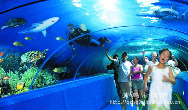 Situated at No. 2 Laiyang Road, Shinan District, Qingdao, neighboring LU Xun Park and No.1 Bathing Beach, Qingdao Underwater World occupies a building area of 7,300 m2 and the entire water body is about 4,000 m3. It displays hundreds of varieties and thousands of precious and rare living marine organisms. The main sightseeing zone is equipped with 7.6m high dia. 5m single column glass containers, and through the 14.4m wide, 3.8m high and 25cm thick acrylic glass walls, visitors can enjoy closely the exciting situation of “Human Shark Dancing”. There is also an open marine laboratory, and visitors can listen to the experts for marine knowledge at the “marine classroom”.